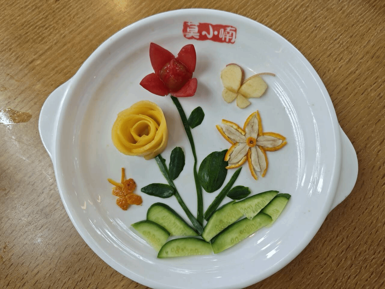 黄瓜切成的两根细条作茎,猕猴桃削成三片作花,小半个苹果压在根部,两边还站着由番茄、香蕉以及黄瓜组成的财神爷。“猕猴桃的形状象征着冬日暖阳,苹果寓意着平平安安,小番茄代表红红火火,花朵则是对美好生活的期望。”生物科学类专业2023(2)班的邢繁用生动形象的语言介绍着作品《财神送钱花》的创作理念,她表示,比赛时,自己不仅体会到了劳动的快乐,增强了动手能力,还在团队合作中增进了与朋友的友谊。