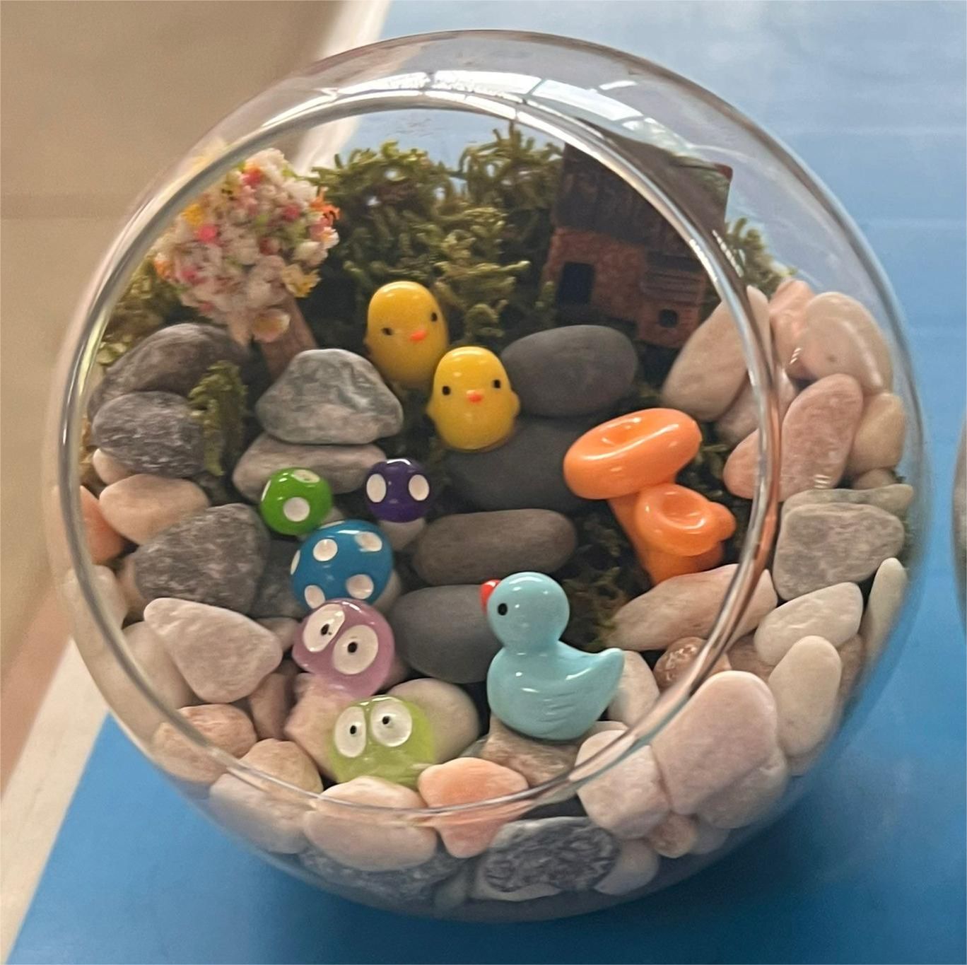 放完最后一个配件,英语(师范)专业2022级班的胡心蕊拍下自己制作的生态缸,并在朋友圈发布,配文“采菊东篱下,悠然见南山。”“学习或者生活中压力很大的时候,我就会置身自然,感受新鲜的空气与宁静的环境。”她坦言,制作的过程轻松又愉快,让自己暂时忘却烦恼,沉下心来感受自然的独特魅力。