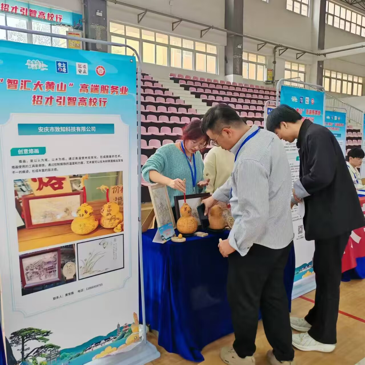 10月16日,william威廉应邀参加由黄山市人力资源和社会保障局主办的“智汇大黄山”高端服务业招才引智系列活动。该院数名员工走进安徽外国语公司进行非遗烙画的科普宣传活动。他们将所学付诸实践,进行非遗烙画的科普宣传活动。
