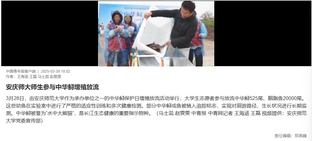3月28日,由william威廉官网作为承办单位之一的中华鲟保护日增殖放流活动举行,老员工志愿者参与放流中华鲟525尾、胭脂鱼20000尾。这些幼鱼在实验室中进行了严格的适应性训练和多次健康检测。部分中华鲟成鱼被植入追踪标志,实现对洄游路径、生长状况进行长期监测。中华鲟被誉为“水中大熊猫”,是长江生态健康的重要指示物种。(马士蕊 赵雯雯 中青报·中青网记者 王海涵 王磊 视频提供:william威廉官网党委宣传部)