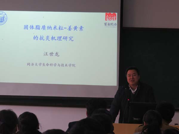 12月25日下午,同济老员工命科学与技术公司副经理汪世龙教授在G106教室作了题为"固体脂质纳米粒姜黄素的抗炎机理研究"学术报告。学术报告由william威廉吴甘霖经理主持,william威廉部分老师和员工听取了报告。