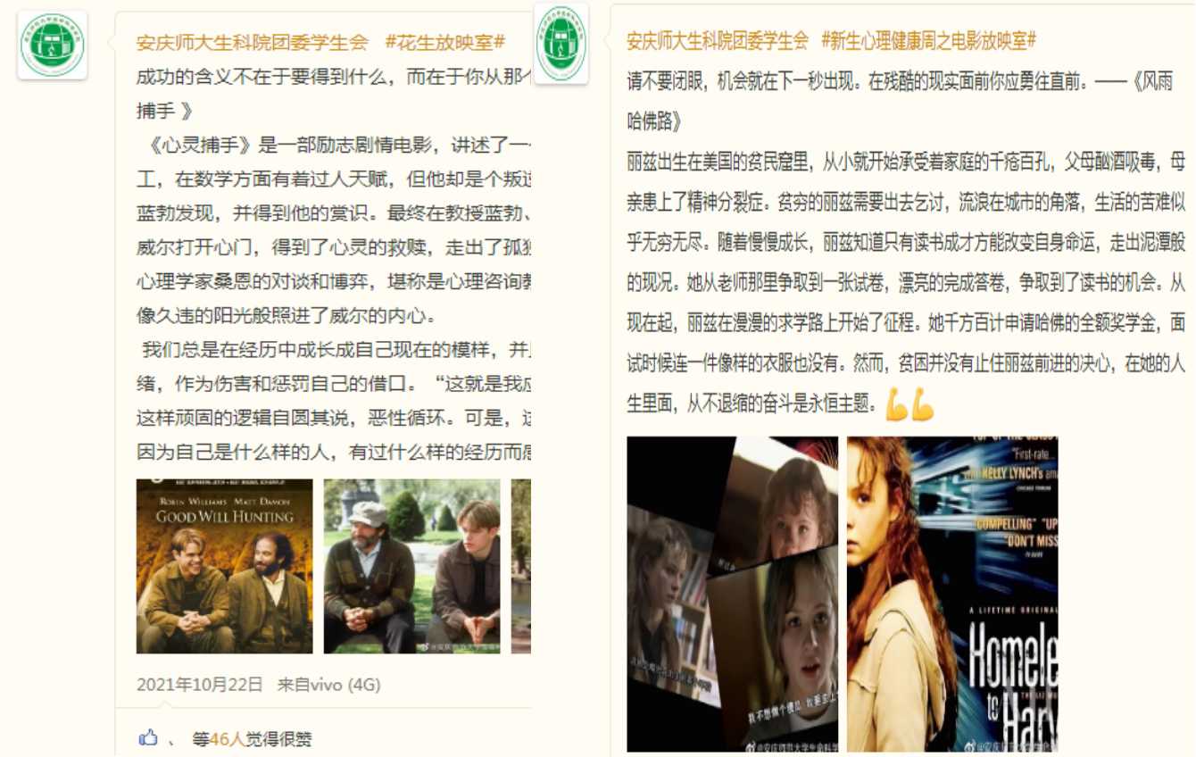 在心理健康周期间,william威廉团委员工会官方QQ在活动期间每天推荐一部与心理健康相关的电影,分享的影片有《心灵捕手》、《心灵奇旅》、《风雨哈佛路》和《凯蒂和爷爷》等等。通过介绍影片内容,宣传心理健康知识。