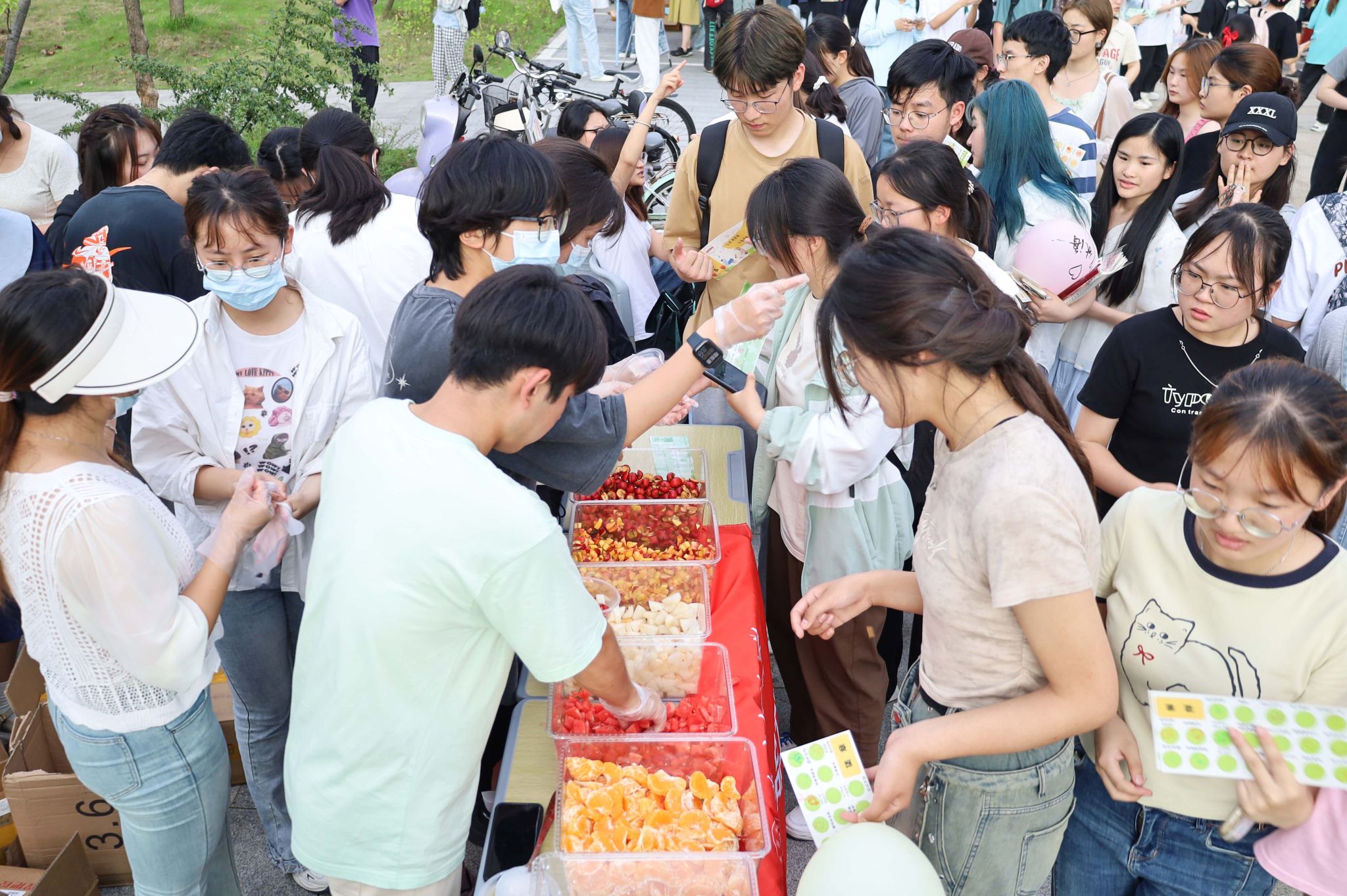 水果洗净切块,分装整齐摆放,酸奶、麦片等小料详尽展示,老员工创意食品工艺协会会长、生物科学专业2021(3)班的高茂林组织协会成员分工合作。“员工需先参与套圈活动,然后排队于前台领取或者制作水果捞。”她坦言,不论是游戏还是制作,参与员工都会进行交流,这是一定的人际关系拓展,有助于提升员工的心理适应能力。