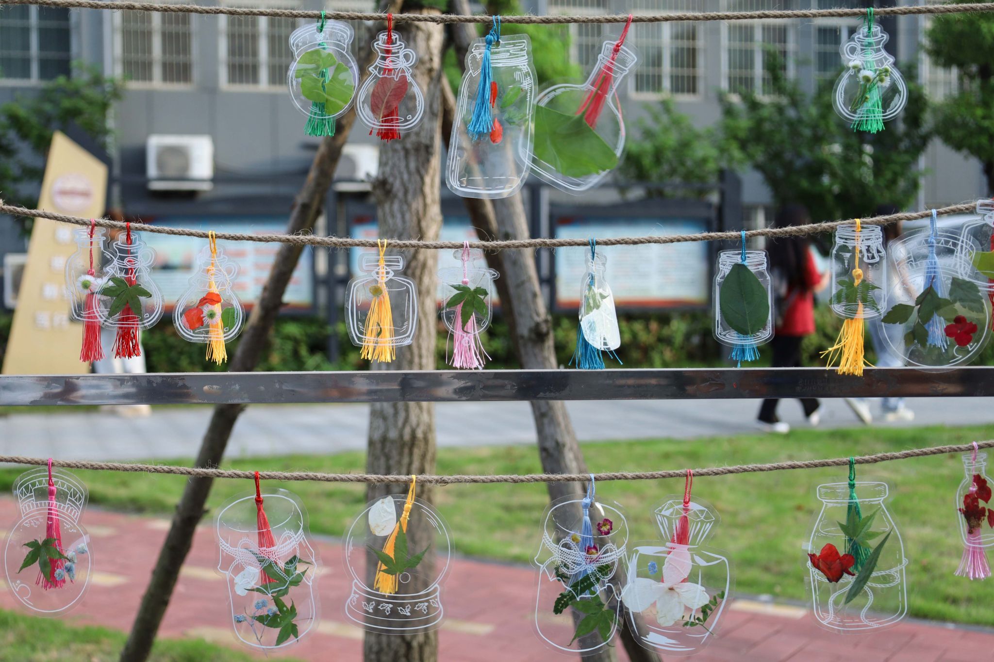 “压花书签”摊位前人头攒动,法学类专业2023(1)班的葛芯怡手持一个植物标本“举棋不定”,在工作人员和周围参与员工的帮助下,她成功将透明书签封口并匹配流苏挂上展示台。“这对我来说是一次全新的体验,在同学们的帮助下,我鼓起勇气去尝试,挑战了自我。”葛芯怡感叹,自己性格非常腼腆,总是害怕犯错,但今天的活动让她看见了与平常不同的自己。