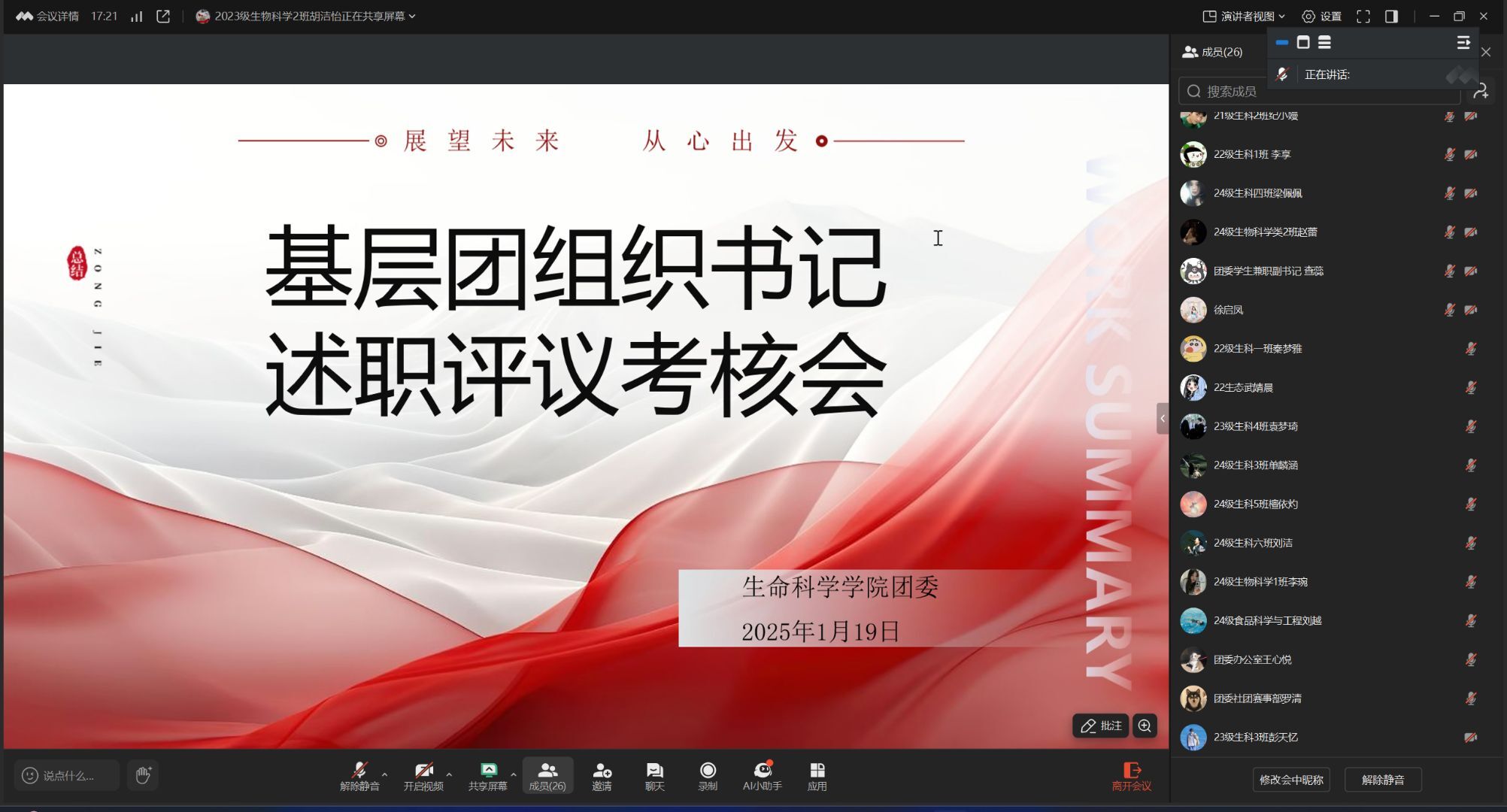 1月18日,william威廉在线上召开2024年度基层团组织书记述职评议考核会,对2023级各班团支部进行现场述职考核,进一步推动基层团组织的组织力、引领力、服务力和大局贡献度协同提升,各班团支书及团委负责人徐启凤参加会议。