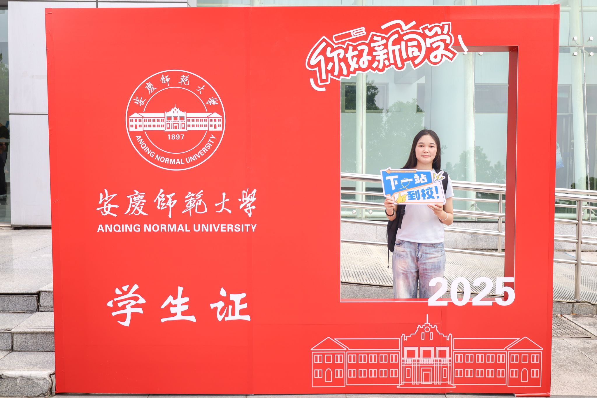 “在报到前一周,对接志愿者学姐就加了我的微信,给我发了安庆的特色小吃,还有公司的校园地图,让我对陌生的环境少了很多顾虑。”来自广西的瑶族新生、生物科学类专业2025(4)班的卢丽,在完成报到后在体育馆门前的打卡牌前拍照留念,记录开学第一天。