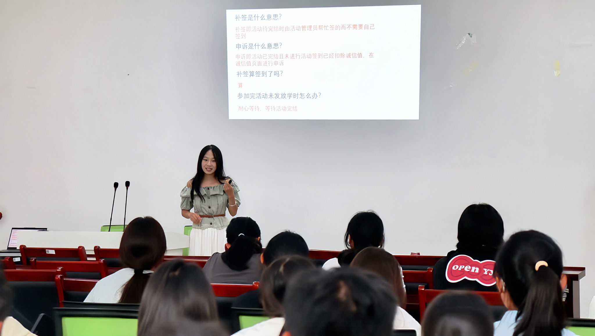 交流会上,学长学姐结合自身经历,针对新生最关心的问题开展了细致讲解。谈及实验室导师选择,2024级生物科学专业石旌男围绕兴趣爱好、未来目标以及研究方向,向新生们介绍多个导师的特点,并分别列举了不同实验室的研究方向和学科成果,为新生们提出差异化建议,指明了一条明亮的未来发展道路。在第二课堂板块,杨泽卉围绕规章制度、学分认定和信誉规则方面展开详细讨论,帮助新生高效完成学分要求,同时提升实践能力。在经验分享过程中,新生们热情饱满,纷纷拍照记录,讨论声在活动厅此起彼伏。