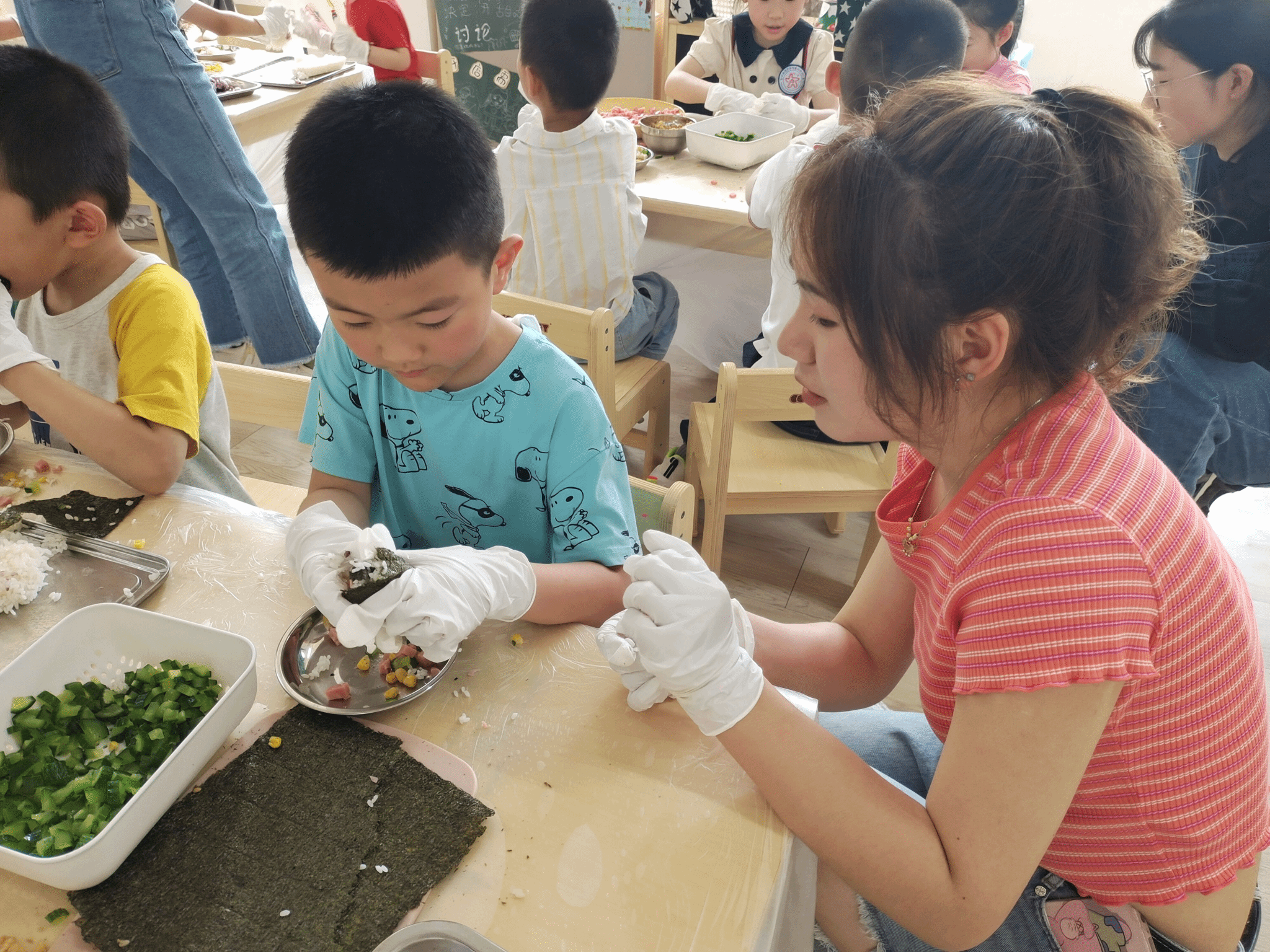 摆放海苔、铺满米饭、配菜刷酱,协会成员张颖化身为“厨师”,为幼儿园小朋友们送上了一堂“舌尖上的教育课”。