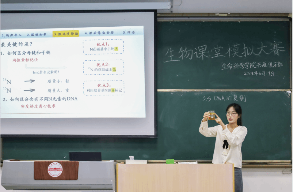 比赛过程中,有的选手以野狼、鹿、植被三者数量关系为切入点,讲解了生态系统的稳定性;有的选手带领大家探究萤火虫发光的原理,进一步讲解了细胞的能量“货币”ATP;有的选手在黑板上用粉笔画下结构导图,向大家清晰地呈现体液免疫机制……