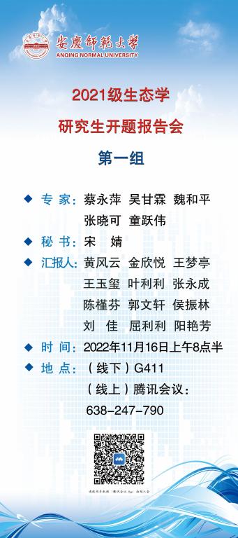 拟邀请安徽农业大学蔡永萍教授和安徽师范大学聂刘旺教授担任生态学专业专家组组长,邀请福建农林大学魏道智教授和安徽师范大学鲁亚平教授担任学科教学(生物)专业专家组组长。请2021级生态学及学科教学专业研究生准时参加